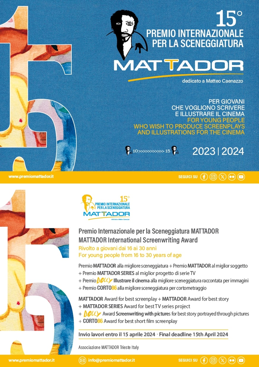 Sono ufficialmente aperte le iscrizioni alla Quindicesima edizione 2023/2024 Premio Internazionale per la Sceneggiatura Mattador, dedicato a Matteo Caenazzo e rivolto a giovani autori dai 16 ai 30 anni.