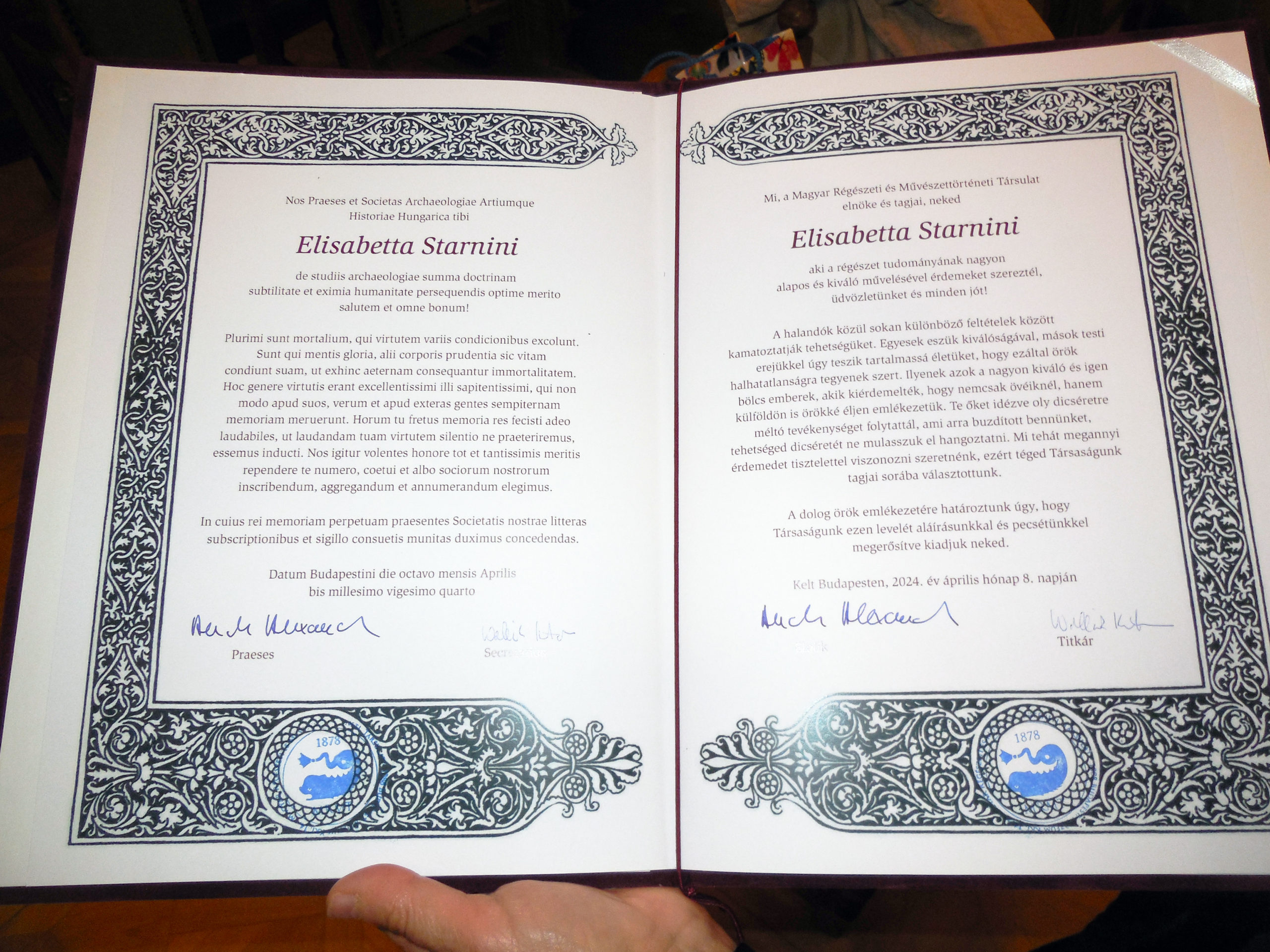 La nomina è stata ufficializzata lo scorso 8 aprile, nel corso di una cerimonia presso il Museo Nazionale a Budapest. La prof.ssa Starnini è la prima archeologa italiana a ricevere questo riconoscimento, come si può vedere dalla lista degli attuali membri onorari della Società.