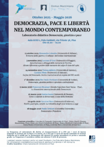 Il laboratorio didattico Democrazia, giustizia e pace dedicato al tema “Democrazia, pace e libertà nel mondo contemporaneo” è un laboratorio annuale da 3 cfu che si svolge da ottobre 2025 a maggio 2026.