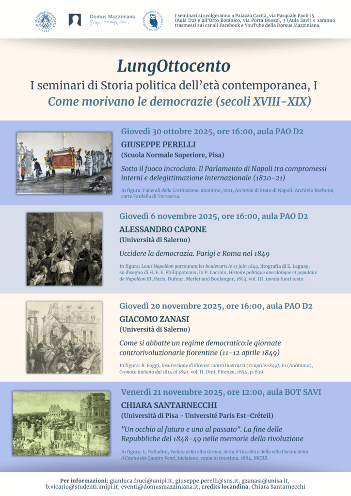Giovedì 30 ottobre prenderà il via il ciclo di seminari di storia politica dell’età contemporanea intitolato “Come morivano le democrazie (secoli XVIII-XIX)” e collegato al corso Storia politica dell’età contemporanea tenuto dal prof. Gian Luca Fruci, all’interno del Corso di Laurea triennale in Storia.
