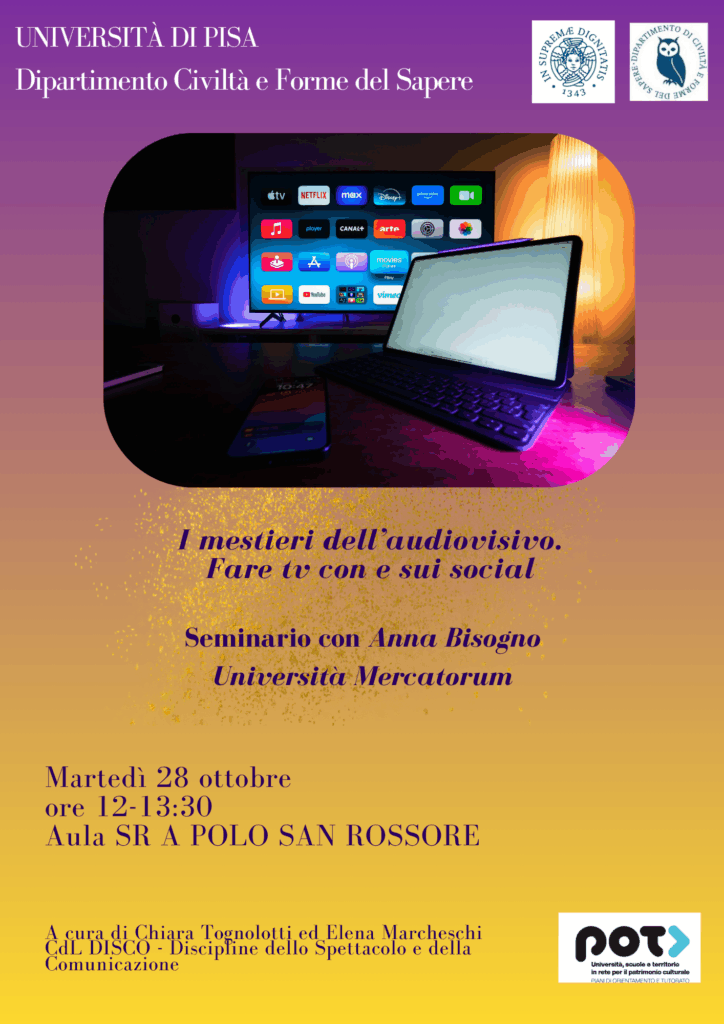Martedì 28 ottobre, alle ore 12, in aula SR A Polo San Rossore, la Prof.ssa Anna Bisogno terrà il seminario “I…